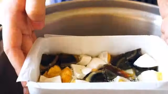 5.蛋黃打散後,鍋里蒸3分鐘後將蛋黃液放進去。然後再蒸5分鐘。蒸熟後不要著急脫模,放涼後整體倒出來,把烘焙紙撕開,再切成薄片,這樣討人喜歡的三色蛋就完成了。