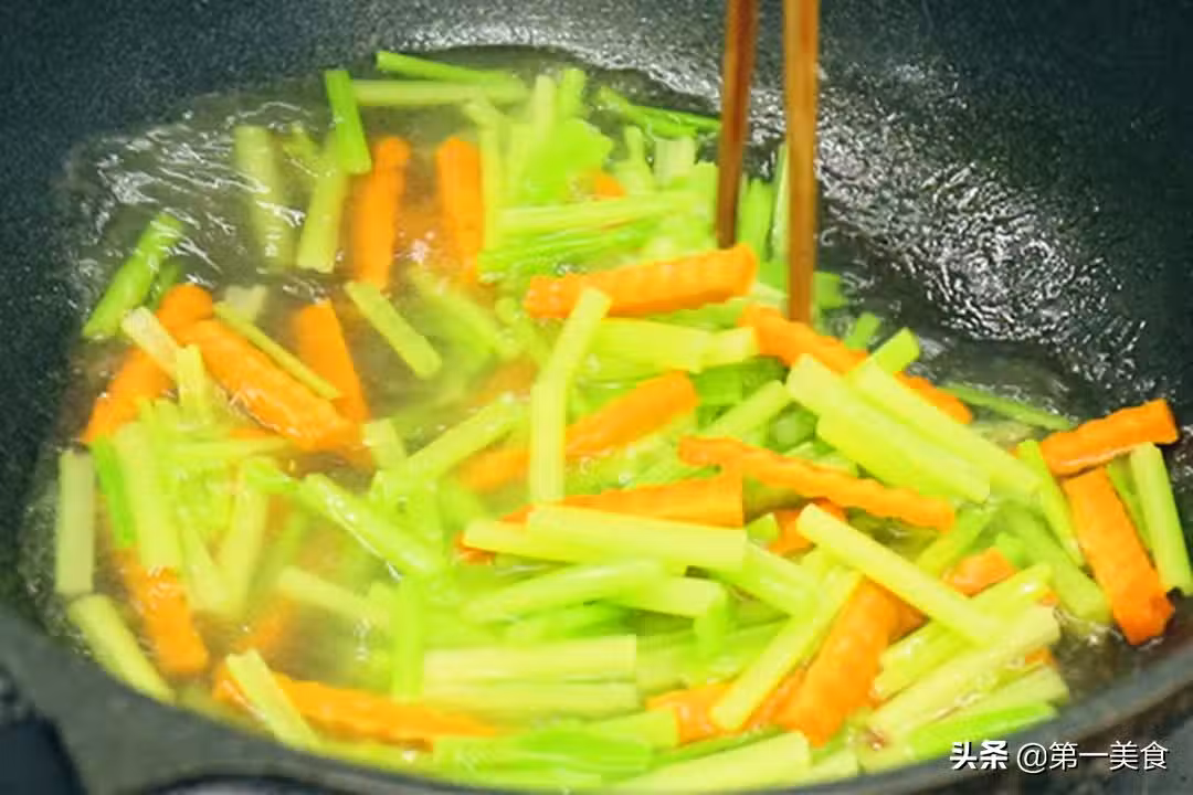 4.鍋內再燒油,放入蔥蒜片爆香,倒入控過水分的配菜,大火快速翻炒均勻,調味只需要放食鹽和雞粉就可以了,繼續翻炒化開調料,再倒入雞蛋大火翻炒至香味融合、即可出鍋。