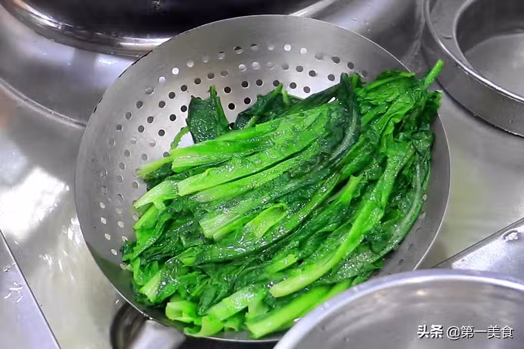 3.然後把控干水分的油麥菜擺放在盤中,澆上調好的料汁,放上青紅椒絲和蒜末等待激油。鍋內燒油,油溫七成熱、油麵冒青煙時起鍋,把熱油澆在蒜末上面激發出蒜香味、美味即成。