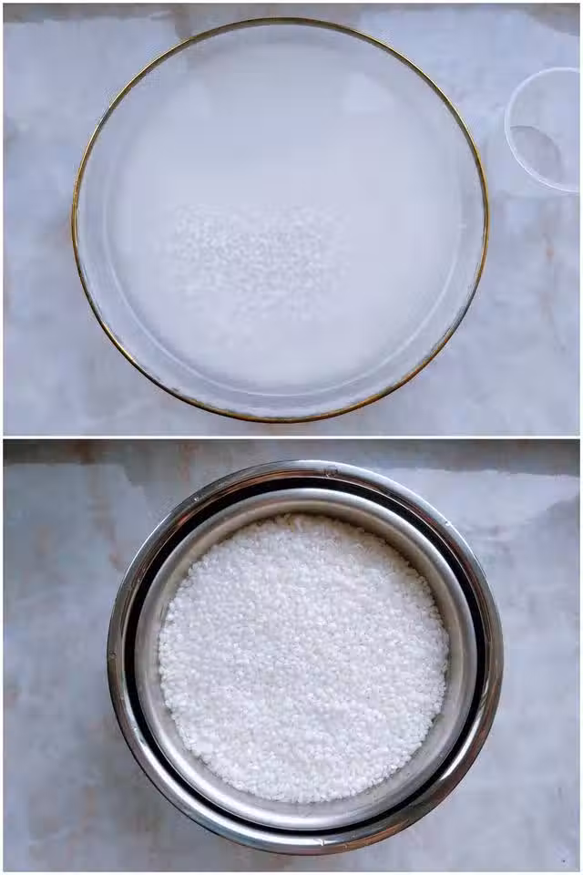 2. 把糯米撈出瀝凈,放入甑子裡的篩網上,再放入內膽,加適量水,稍蓋過糯米。