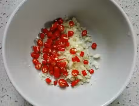 第四步,鍋中添上水,隔水放入豆角開始蒸,差不多15分鐘的時間,豆角便被蒸熟了,小米辣洗乾淨後切成丁,大蒜剝皮後切成蒜末,一同放入一個碗中;