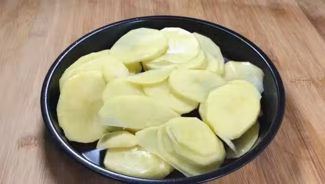 1.首先準備一個大土豆,洗凈去皮,對半切開,然後切成薄片,再冷水入鍋,開大火蒸15分鐘左右。