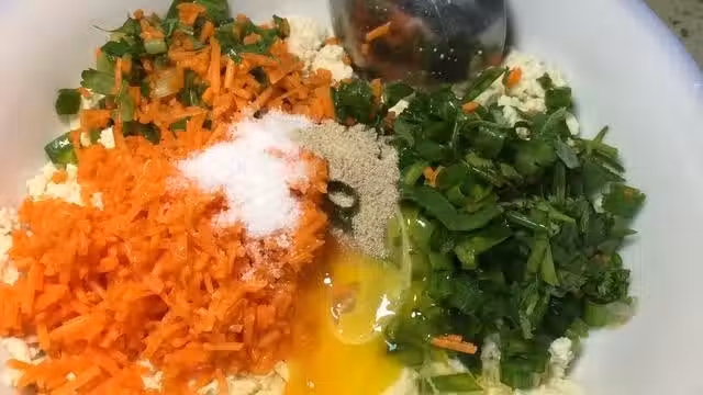 加入胡蘿蔔丁、小蔥、鹽、胡椒粉、雞蛋攪拌均勻。