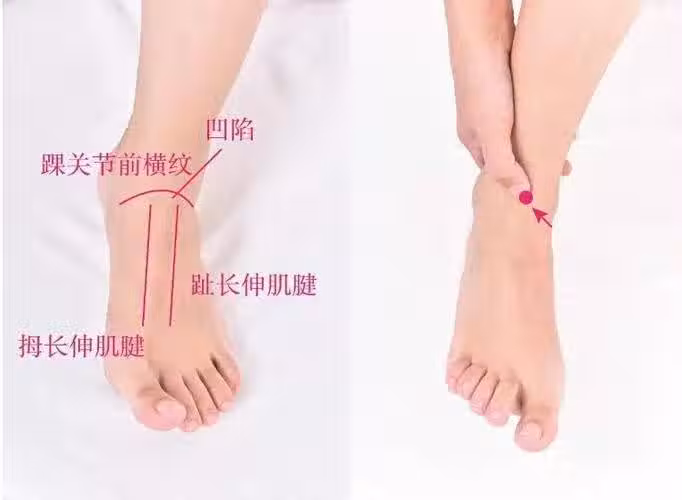此穴在腳背與小腿交界的地方,橫紋中央的凹陷之處,平時可以刺激解溪穴來幫助改善腦部氣血不足的情況,在按摩時,可以用大拇指按壓此穴,逐漸慢慢用力,在慢慢松開,因此一壓一松為一個循環,這樣重復按摩30個循環。