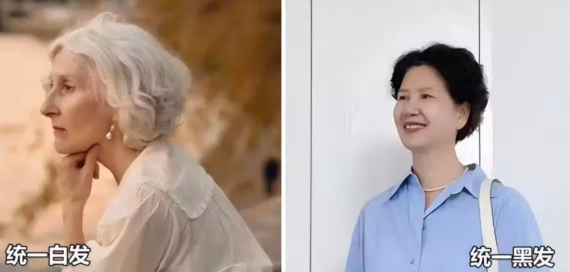 但女性變老是緩慢的,是一個長時間的過程。白髮也不是竇然而生一夜全白的,而是在茂密的黑髮當中悄然出現一根,兩根再到無數根。因此在這個暗色系頭髮轉變為亮色系頭髮的過程當中,就會出現一個十分尷尬的情況,也就是明暗交雜黑白相摻。當明暗衝突對比強烈人們的視覺就會受到衝擊,給人一種雜亂無章野草叢生般的不適感。這也是為什麼黑白相間的頭髮看起來讓人很不舒服的原因。