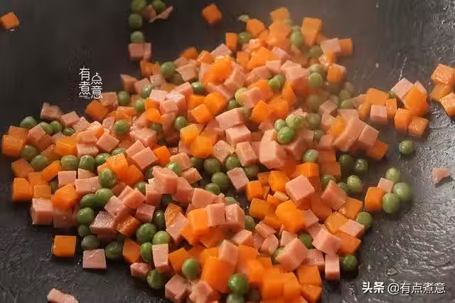 6、鍋內不用放油,直接倒入胡蘿蔔、青豆和火腿丁翻炒,因為胡蘿蔔和青豆是水煮熟的,炒一下收干點水分會香點。大概炒1分鐘左右就可以了。