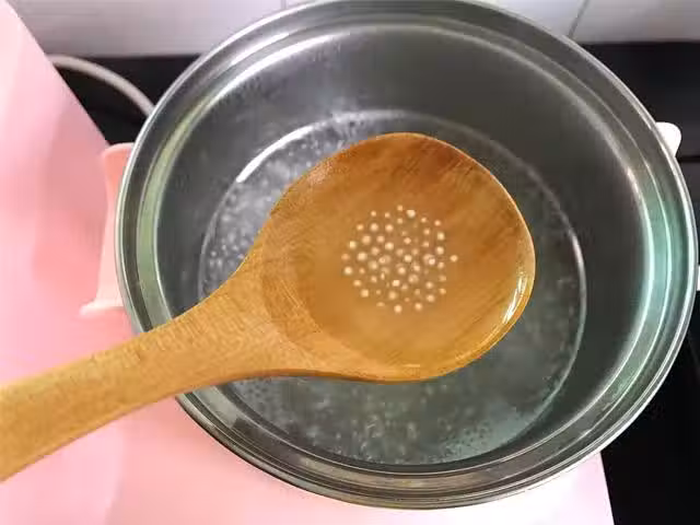 4、把煮好的西米撈出過涼水後放入事先準備好的冰水中,放入冰水中可以使西米更Q彈。