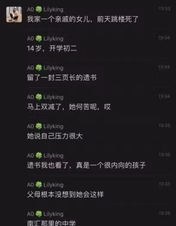 根據綜合陸媒報導,該名先行一步的國中女親戚事後透過網路表示,該女孩平時非常乖巧又內向,但因為成績總是達不到父母的期望,常常被認為是不夠努力用功,因此時不時就媽媽惡言相向、甚至還恨鐵不成鋼地常常動手毆打,最後在承受不了長期的高壓之下,才選擇用這樣的方式解脫。