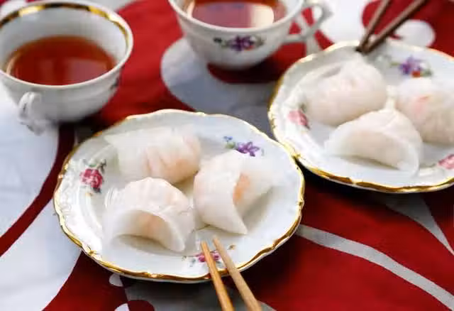 水晶餃是因皮如水晶般透明而得名,餡料可以是多種多樣,但廣州茶樓里好像就是這三種:蝦餃皇,鮮蝦野菌餃和鮮蝦韭菜餃。