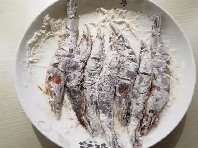 到時間後,將大蝦放在麵粉內,均勻的裹上一層麵粉,抖去多餘的麵粉。