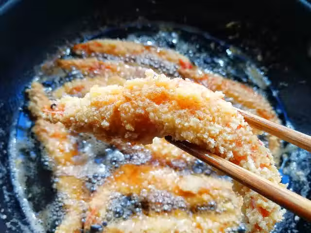 鍋加油燒熱,燒至六成熱,逐個下入大蝦溫油炸制,期間,將大蝦翻幾次面炸制,這樣可以讓大蝦兩面炸制顏色一樣,將麵包糠顏色炸制金黃,撈出控油,裝盤即可,炸制時,要控制一下油溫,先下入大蝦炸制定型,再用中小火炸制大蝦,一直用大火,容易把大蝦炸得外焦里不熟。