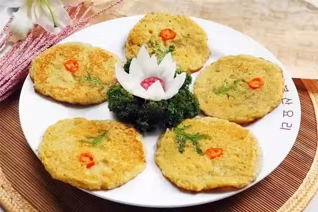 3.將調好的蛋液拌入土豆泥中,調節至適宜軟度,再分成大小均勻的小團,壓扁;