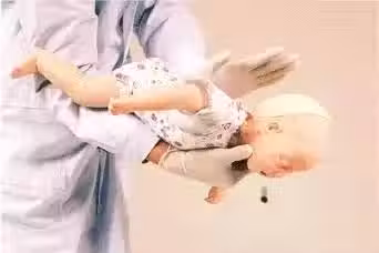 救護人應該馬上把孩子抱起來,一隻手捏住孩子顴骨兩側,手臂貼著孩子的前胸,另一隻手托住孩子後頸部,讓其臉朝下,趴在救護人膝蓋上。在孩子背上拍1-5次,並觀察孩子是否將異物吐出。