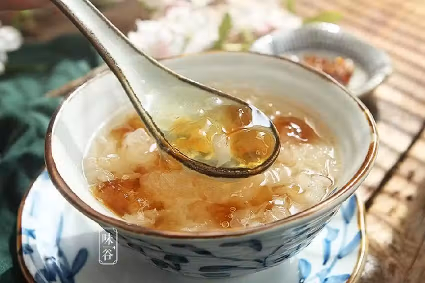 桃膠有清血降脂,緩解壓力和抗皺嫩膚的功效,銀耳加桃膠一起燉煮,看起來晶瑩剔透,滿滿的膠原蛋白哦!喝起來口感溫潤綿滑,很享受。