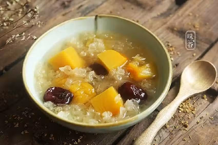【材料】:南瓜 150克、銀耳半朵、紅棗8顆、冰糖適量、