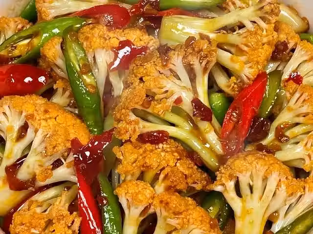 干鍋花菜是一道四川菜,用花菜和培根等配料一起炒制而成,花菜清甜爽口,培根香咸酥脆,干鍋的方式使得菜肴更加香氣四溢。這道菜是一道很適合素食者或者減肥者的菜,可以作為主食或者配菜,既美味又健康。這道菜不僅好吃,還有營養價值。花菜含有豐富的維生素C和鉀質,可以增強免疫力和抗氧化。培根含有優質的動物蛋白質和脂肪,可以提供能量和滿足口感。