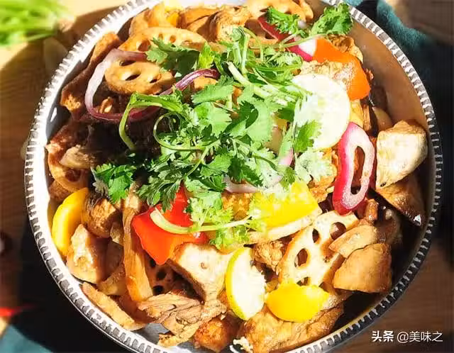 三黃雞600克、蓮藕1個、萵筍300克、花菜200克、洋蔥半個、豆泡100克、香菇6個、荔浦芋頭300克、彩椒1/4個、青檸檬1個、香菜6根、蔥10克、姜15克、大蒜1頭、花椒3克、麻椒2克、干辣椒2個、研磨胡椒粉3克、花雕酒2湯匙、生抽3湯匙、老抽0.5湯匙、醋1湯匙、油香辣郫縣豆瓣醬適量、糖3湯匙、鹽3湯匙。