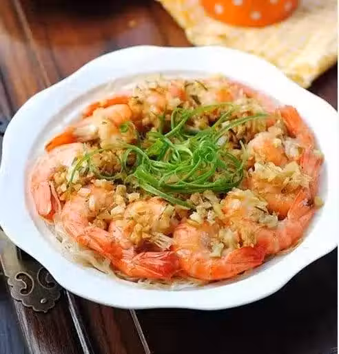 去頭大蝦、粉絲(事先開水泡發)、蔥姜蒜(切末)、生抽1.5勺、陳醋1勺、香油半勺、水1勺、紅糖半勺、鹽適量調成醬汁。