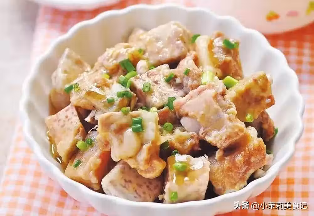 4、接著將芋頭放到蒸盤的底部,上邊放排骨,在蒸鍋里大火蒸一個小時左右,將食材徹底蒸熟為止。