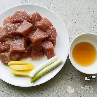 2、豬肉(不要有筋)切成大塊,準備好蔥,姜,料酒。