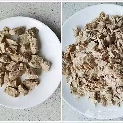 4、撈出肉塊擦乾水分,放涼後裝進保鮮袋用擀麵杖或者刀背拍扁,原本500克的豬肉煮熟後差不多剩下一半的重量。