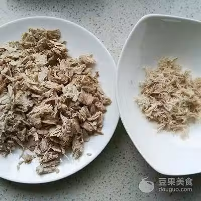 5、再用手撕成肉絲,越細越好,注意把細小的筋腱還有脂肪組織剔除,想得到蓬鬆酥香的肉鬆,這一步很重要,足夠考驗你的耐心喔,看看電視或者聽聽音樂就不會覺得無聊啦。