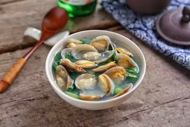 【芥菜車螺湯】食材:芥菜1小把,車螺500克,薑片4片,料酒10克,胡椒粉2克,鹽適量