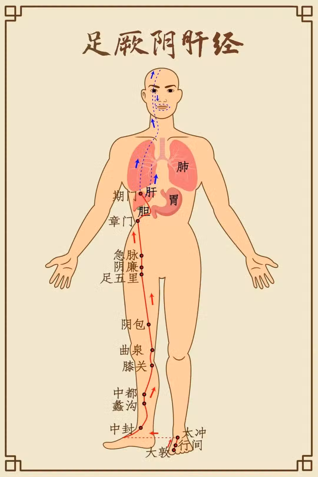 肝經起於足大拇指,從下往上繞陰部再到小腹(子宮),再經過胸部[乳.房],再到脖子甲狀腺。