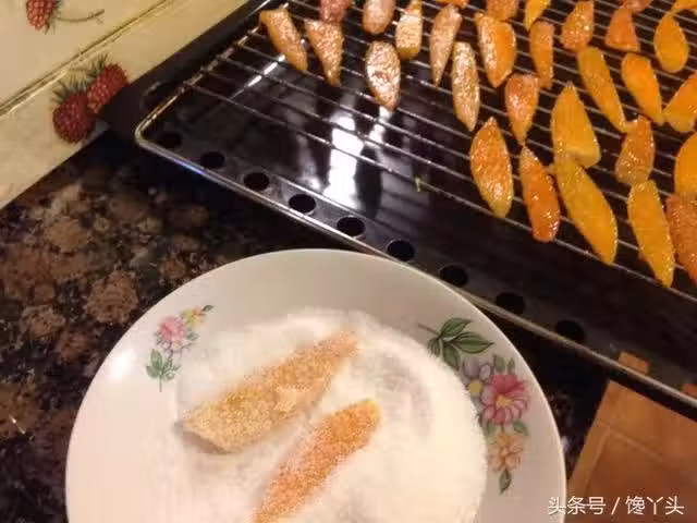 晾乾以後,再把橙皮放在細白糖里滾一下,就是橙皮糖了。