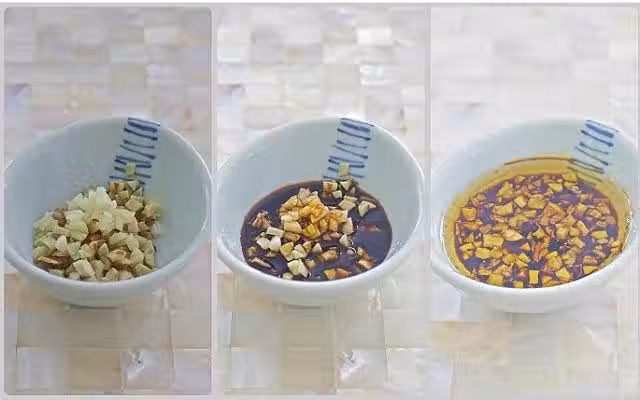 沙姜切小粒,蒜頭切小粒,兩樣放在碗里,加入生抽,加入煮沸的花生油,攪拌即可。