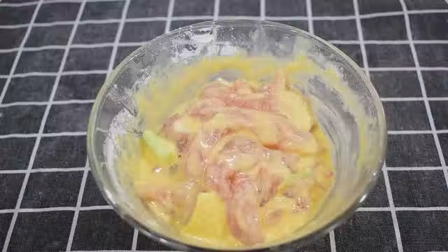3、腌制好的裡脊肉加入一個雞蛋,1勺澱粉,1勺麵粉,抓勻,讓每條裡脊肉都粘裹均勻,再加入1勺生油抓勻;