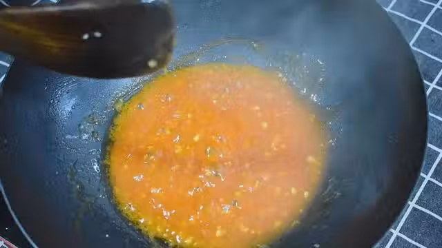 3、鍋中留底油,放入蒜末炒香,倒入調好的醬汁,輕輕攪拌至濃稠,加入少許鹽,1勺熱油(使醬汁更紅亮);