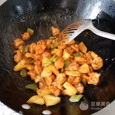 13、最後下入青椒和菠蘿翻炒幾下即可。