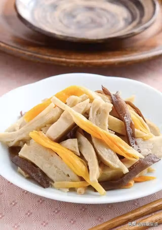 2 熱鍋,倒入植物油,放入薑絲爆香,再加入素肚絲拌炒香,接著放入金針菜、黑木耳絲炒勻。