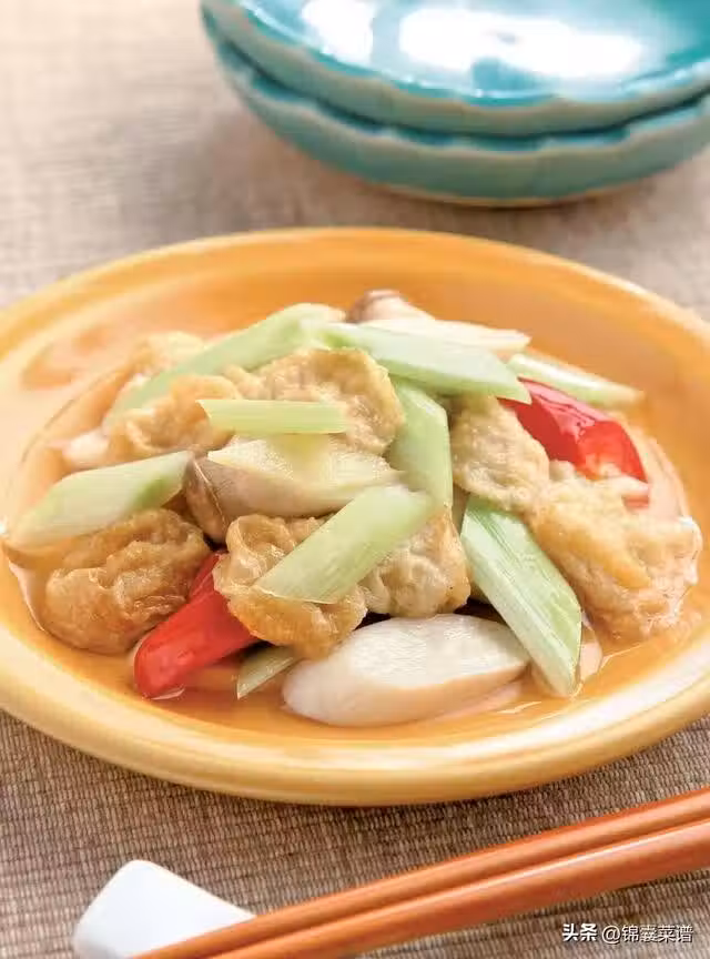 2 熱鍋,加入油,放入薑片爆香,放入杏鮑菇片、金針筍片和紅甜椒片拌炒,再放入麵筋、水和其餘調料,炒至入味即可。