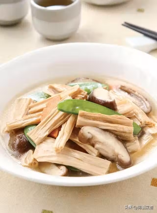 腐竹 50 克,鮮香菇 40 克,洋菇 30 克,胡蘿蔔片 20 克,甜豆莢 40 克,薑片 5 克,水 200 毫升
