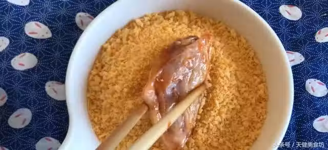 雞翅腌制好之後呢,我們用筷子,夾起一塊雞翅放到麵包糠上面,然後用筷子翻面,讓雞翅的每個面都裹上一層麵包糠!麵包糠本身是乾的,裹上麵包糠一方面可以讓炸出來的雞翅更佳的外酥里嫩,另一個方面則可以在油炸的過程中,使油不炸起來!