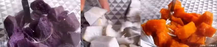 做好涼粉之後,紫薯,香芋,南瓜也蒸熟了,取出裝入大容器當中,然後用湯匙或者比較硬的廚房用具把蒸好的紫薯,香芋,南瓜全部都壓成泥,壓得越碎越好,方便接下來的操作!