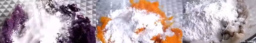 紫薯,香芋,南瓜完全壓成泥之後,根據份量,每100克的紫薯,香芋,南瓜泥加入120g的木薯粉,然後趁熱用筷子攪拌均勻,攪拌均勻之後,用手揉成麵糰,如果太干可適量的加入少許的開水,但是量不要過多。