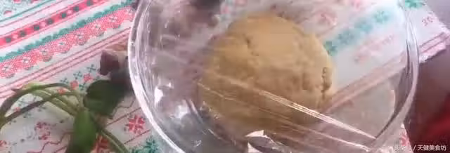 等食材充分混合好之後,分多次加入溫水,加入溫水後,用筷子攪拌麵粉,直至麵粉成絮狀,然後用手把絮狀的麵粉揉成麵糰,揉至麵糰表面光滑即可,然後用保鮮膜把麵糰包在容器裡面,常溫醒發30分鐘!