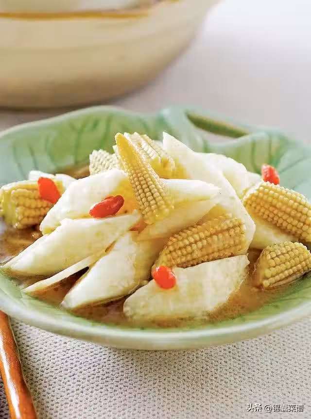 山藥 200 克,玉米筍、薑片各 30 克,枸杞子 10 克,水 60 毫升
