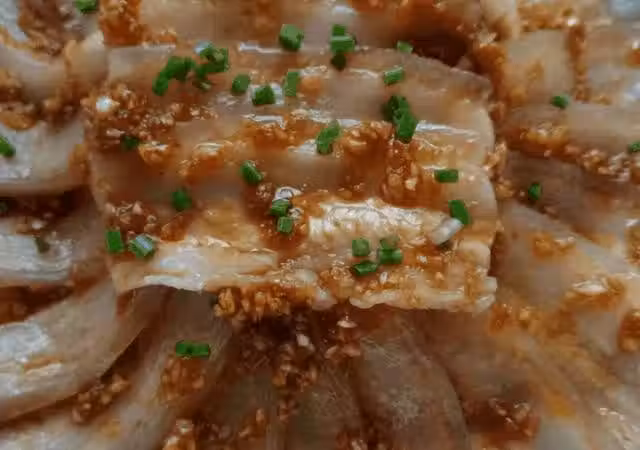 準備蒸鍋,將腌制好的五花肉片擺放在蒸網上,上層撒上一些蔥段和薑片。