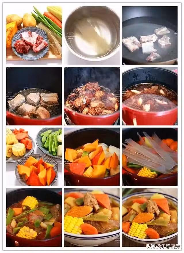 第八步:排骨燉的差不多了,揭蓋,把南瓜、土豆、胡蘿蔔、豆角、玉米放入鍋中,再次蓋好鍋蓋,燉20分鐘左右。