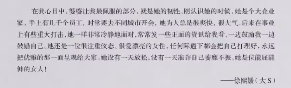 大S表示婆婆令她很佩服,為人爽快,面對困難冷靜處理,是個能屈能伸的女人。言語之間充滿了敬佩之情,這也從側面證明了兩人之間關係融洽。