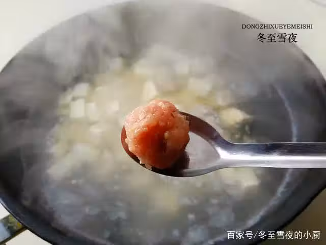 7.關小火,將肉餡放於左手中從虎口往外擠出丸子,右手用勺子接住然後放入鍋內(或者用勺子挖出丸子的形狀)