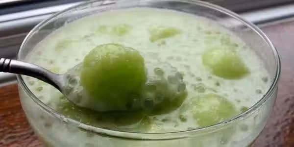 材料: 蜜瓜1粒,西米50克,椰漿150毫升,白糖適量