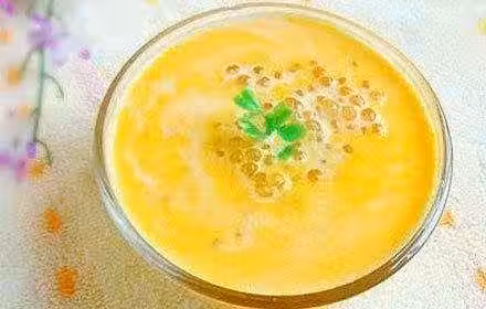 6. 取南瓜泥5-6大匙,加入鮮奶300cc以果汁機攪拌均勻。7. 倒入杯中,加入適量的西米即可。