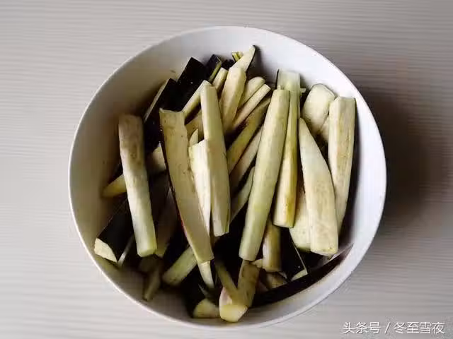 3.將茄子放在大碗中,加上少許鹽,拌勻,腌制10分鐘,腌制出水,這樣炒制時茄子就不會吸收太多的油,也很容易炒制