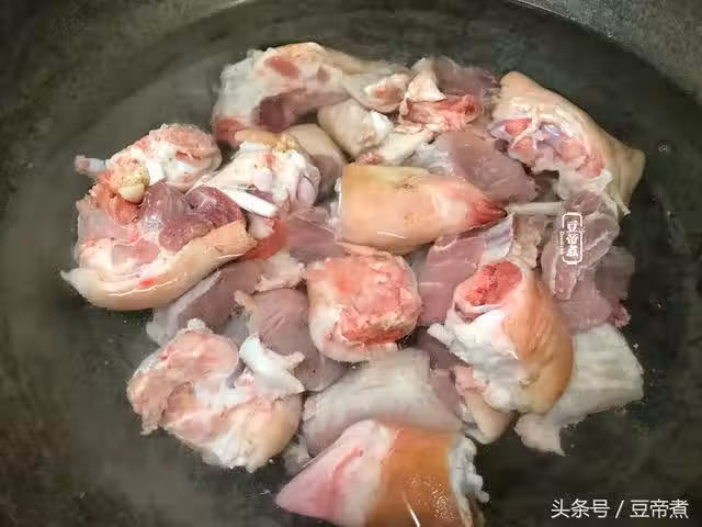 2、豬腳切成小塊後清洗乾淨,冷水下鍋汆水幾分鐘撈出再次清洗乾淨。這一步驟不能省,很多人說我做出的豬腳有異味很影響食慾所以說不能偷懶。