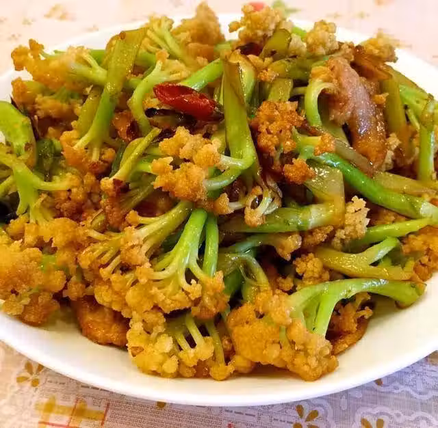 五花肉切片,花菜洗凈切開小朵,然後焯水撈出備用,辣椒切長段,大蒜切片。熱鍋涼油,油三成熱,放入五花肉,慢慢焙出油。肉炒好後,加入紅干辣椒和大蒜片翻炒。加入花菜,青辣椒翻炒,由於花菜焯過水,所以炒的時間不易過長。待花菜邊緣略微有一點點焦加入一點老抽調色,一點糖和適量鹽和味精,出鍋即可。